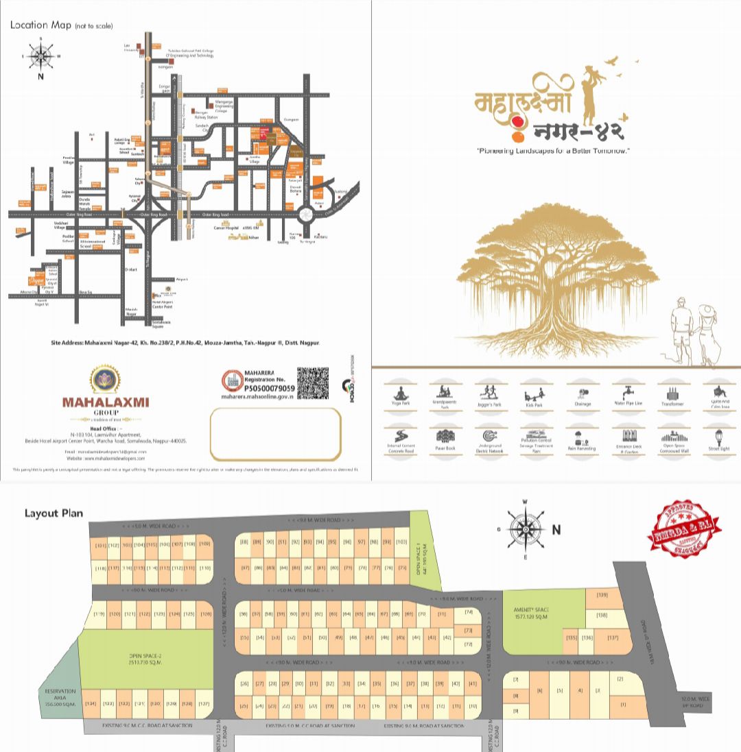 Mahalaxmi Developers launched the project Mahalaxmi Nagar 42. The layout is NIT / NMRDA sanctioned with RL. Bank finance is available 75% to 80% from any nationalized bank. NIT / NMRDA sanctioned layout with RL Good location for investment Layout Fencing with Entrance Gate Plantation to Entire Layout All the basic facilities included. Amenities that Enhance Your Lifestyle: 1.Internal Cement Concrete Road A paved road within the premises connecting all major parts. 2. Sewage Line Underground waste disposal system in layout. 3. Electric Network With Transformer Electricity distribution infrastructure for plots and amenities. 4. Kids Park A playground for children in layout. 5. Garden Landscaped green space with plantation for better experience. 6. Storm Water Drainage A paved road within the premises connecting all major parts 7. Open Space Public Utility An open-use area available to all the residents in the layout. 8. Sewage Treatment Plant A dedicated pitch area for cricket sport. 9. Open Space Compound Wall Fenced open area boundary to the space provided.